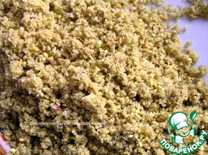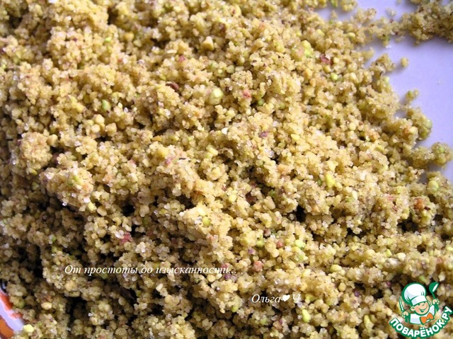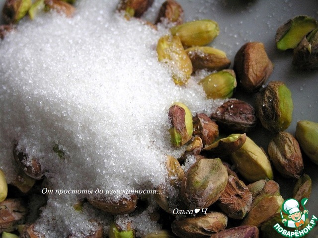 Фисташки поместите на 1-2 часа в морозильную камеру, затем смешайте с 35 г сахара.