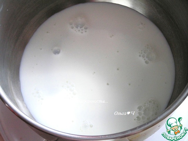 Приготовьте крем. Залейте желатин водой и дайте ему набухнуть. Молоко доведите до кипения, снимите с огня, добавьте сироп и перемешайте.