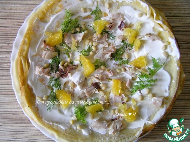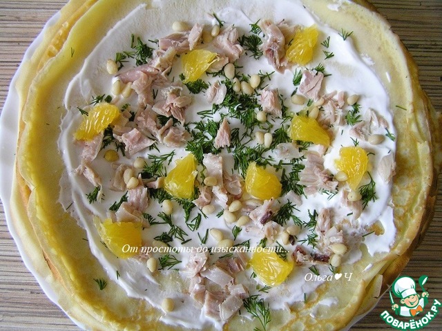 Апельсин разберите на дольки (лучше очистите от пленок, но не обязательно), каждую нарежьте на 3-4 части, выложите на блинчик, добавьте нарезанное маленькими кусочками куриное мясо, посыпьте кедровыми орешками.