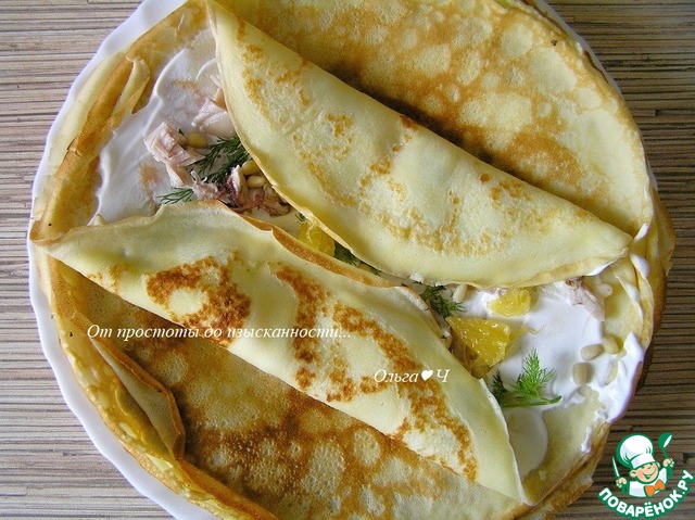 Аппетитные блинчики с курицей, апельсином и кедровыми орешками для тех, кому нельзя сладкое или кто любит блинчики посытнее. В составе начинки диетическая курочка, сочный апельсин, кедровые орешки и зелень. К тому же, когда приходит масленица, уже нельзя есть мясные продукты, так что сейчас как раз самое время попробовать эти блинчики!