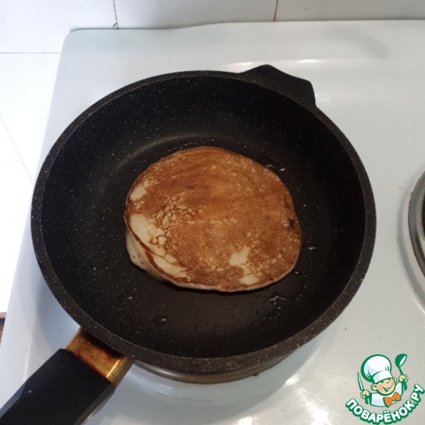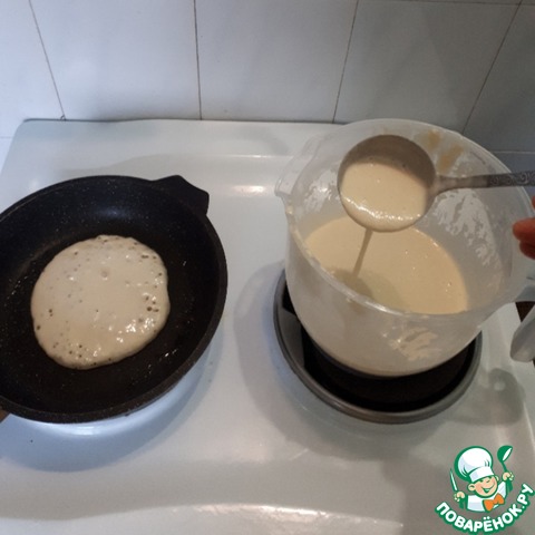 Наливать тесто в центр сковороды, поварешкой слегка размазывать тесто в круг. Блины должны быть толстенькими. Я наливала по одной проварешке, ее объем 40-45 мл.