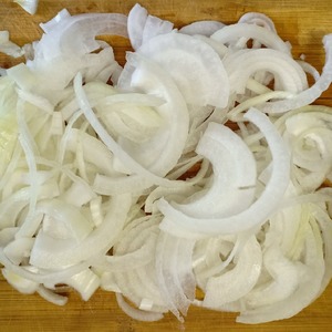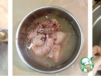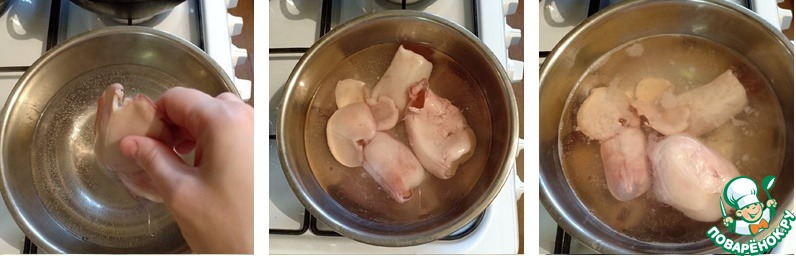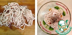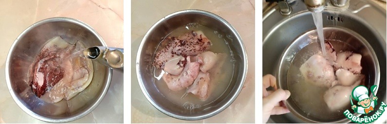 У кальмаров удалить внутренности, обдать кипятком, подержать в горячей воде около минуты и промыть под проточной водой. Под воздействием высокой температуры шкура легко и быстро сойдёт с тушки. Вам придётся лишь удалить её остатки при промывке.