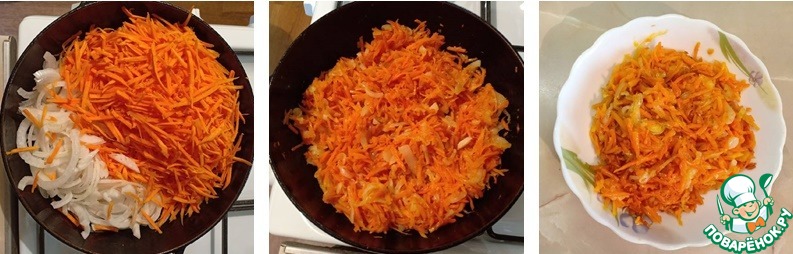 В глубокую сковороду налить масло, разогреть. Выложить лук и морковь, обжарить до готовности на среднем огне. Затем переложить в миску, остудить.