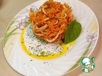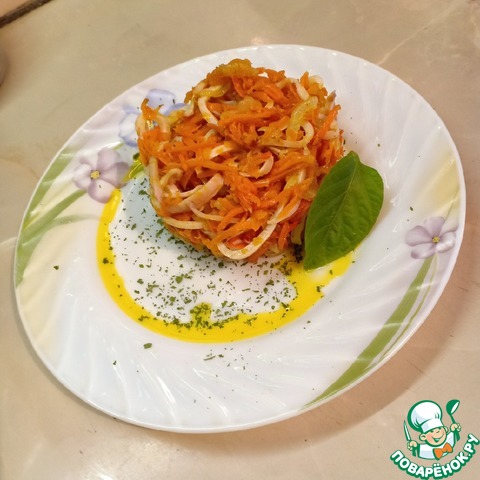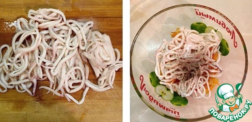 Кальмаров остудить, нарезать полукольцами, смешать с обжаренными луком и морковкой, посолить и поперчить по вкусу, хорошо перемешать.