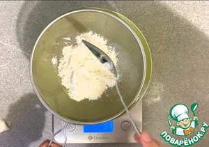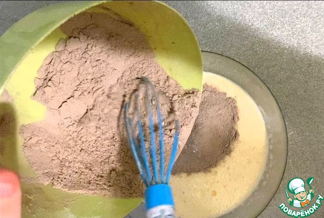 Просеиваем через сито все сухие ингредиенты, добавляем разрыхлитель, если его не оказалось, можно заменить содой гашёной уксусом.