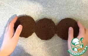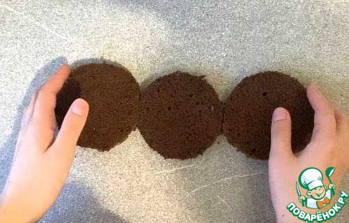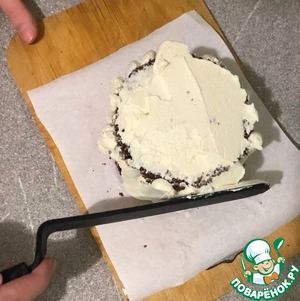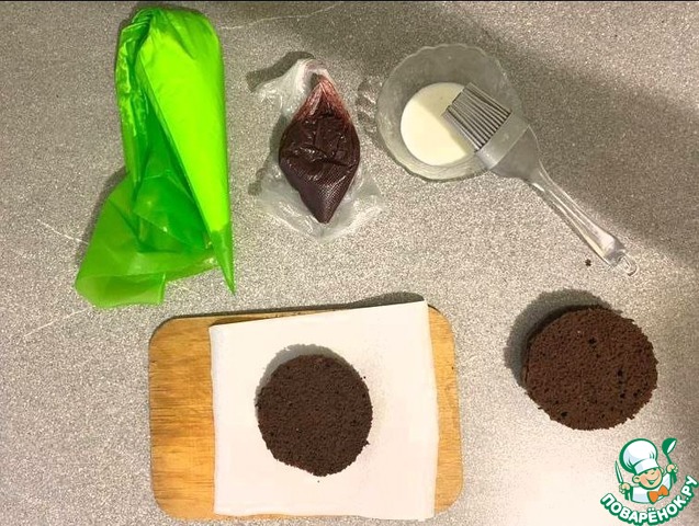 Пропитываем каждый корж, делаем бортик из крема. Затем подготавливаем начинку. Так проделываем 2 раза.