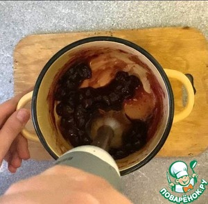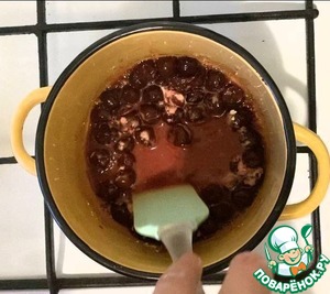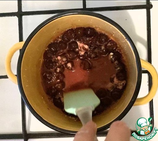 Смешиваем крахмал, воду, вишню и сахар, варим до загустения.