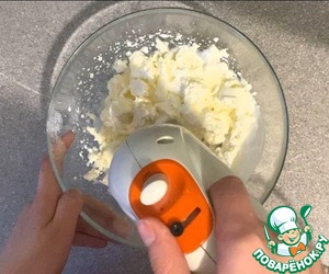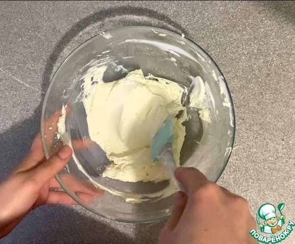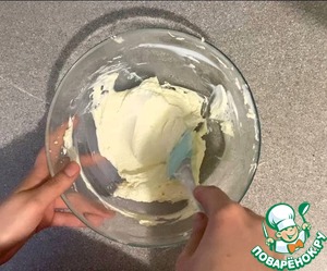 Взбиваем сливки с сахарной пудрой. Затем добавляем творожный сыр и аккуратно соединяем со сливками.
