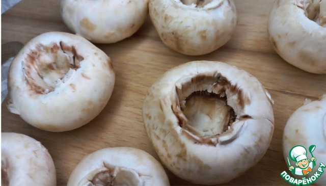 Шампиньоны будут фаршированные, поэтому острым ножом аккуратными движениями, вырезаем грибные ножки. Их можно оставить для начинки. В данном рецепте не использовала при приготовлении.