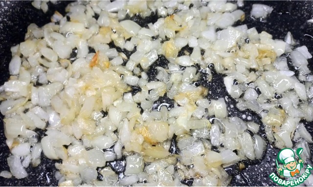 Репчатый лук очищаем, нарезаем мелкими кубиками. Обжариваем на предварительно разогретой сковороде с добавлением небольшого количества растительного масла до золотистого цвета. Даём немного остыть.