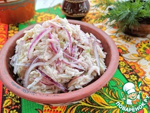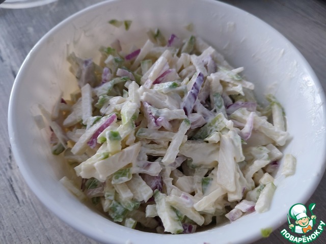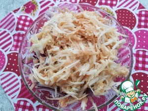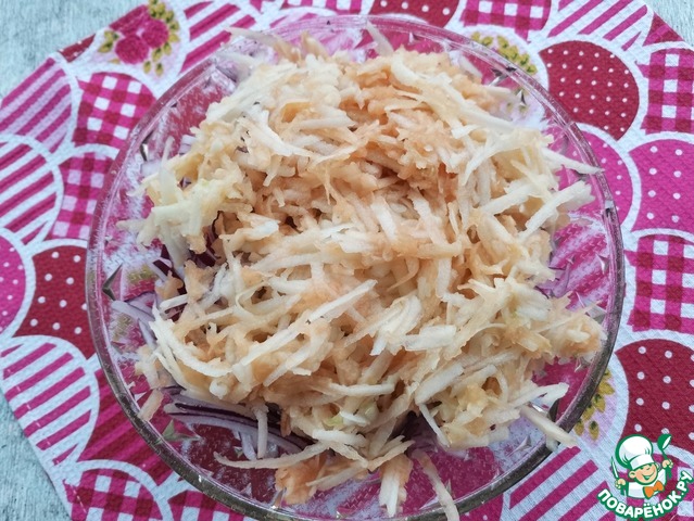 *Ядрёную редьку предварительно замочить на 15 минут в холодной кипячёной воде. Затем отжать. -