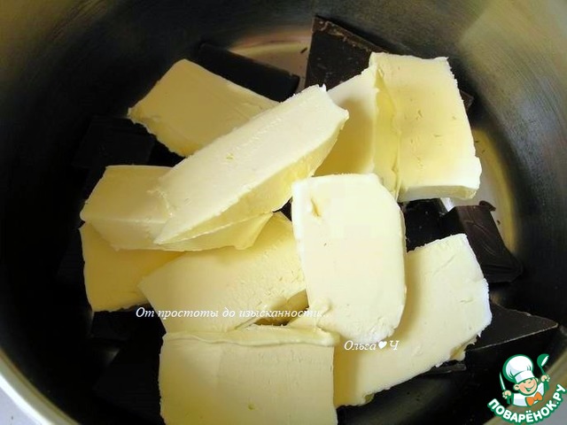 Я готовила полпорции. Но можно и треть приготовить, если хотите, продукты хорошо делятся, а сахара тогда вполне хватит и 75 г. Важное условие: все ингредиенты должны быть комнатной температуры. Разогрейте духовку до 170*С. Шоколад поломайте на кусочки и выложите вместе со сливочным маслом в кастрюльку.