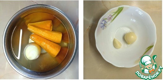 Почистить лук, морковь и чеснок.