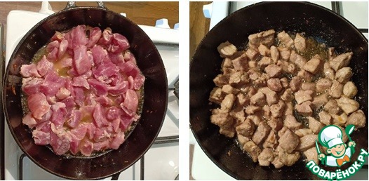 В глубокую сковороду налить подсолнечного масла, разогреть его до появления пузырьков, затем в раскаленное масло положить кусочки мяса, обжарить его на сильном огне до появления легкой золотистой корочки.