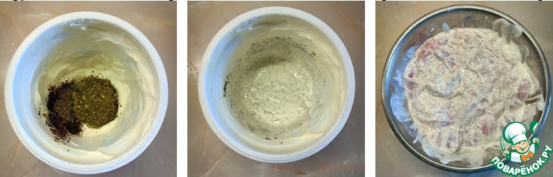 Приготовить сметанно-горчичный соус: смешать сметану, соль, горчицу, перец, тархун и мелко порубленный чеснок. Все перемешать и обмазать этой смесью кролика. Оставить на 3ч мариноваться.