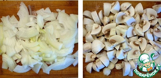 Почистить лук и нарезать полукольцами или четвертинками. Грибы помыть, почистить и порезать крупными кусочками.