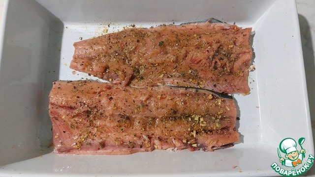 Рыбу разделать на половинки. Смазываем специями с растительным маслом, либо с капелькой майонеза. Убираем ее мариноваться в холодное место.