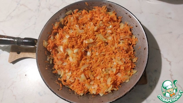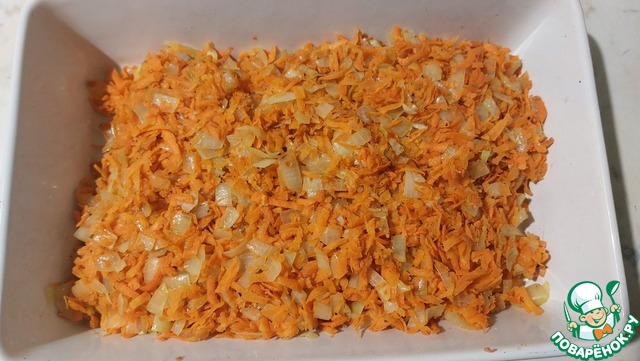 Пока рыба маринуется, приступаем к приготовлению "шубки". Морковь натираем на крупной терке, лук нарезаем не очень мелко. Обжариваем до полуготовности. Эту смесь я обычно присаливаю и перчу.