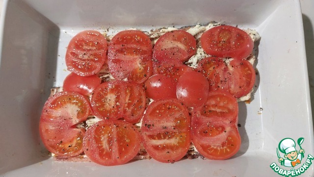 Овощи готовы, можно приступать к сборке блюда. На рыбу сверху укладываем слой нарезанных кружочками помидоров, солим, перчим. Можно посыпать зеленью.