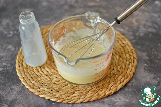 Теперь при помощи венчика начните медленно и методично смешивать сухую и жидкую часть теста. Первую порцию сливок и яйца важно размешать до гладкости и только потом вливать сливки ещё и ещё, размешивая тесто венчиком. Так вы избежите комков в тесте.