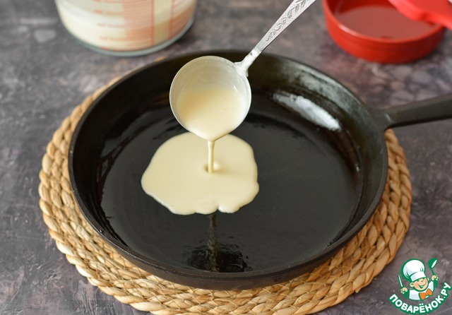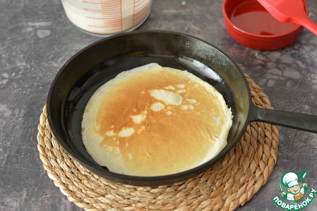 Распределите тесто по сковороде, округляя его и дайте блину спокойно печься на первой стороне пару-тройку минут.