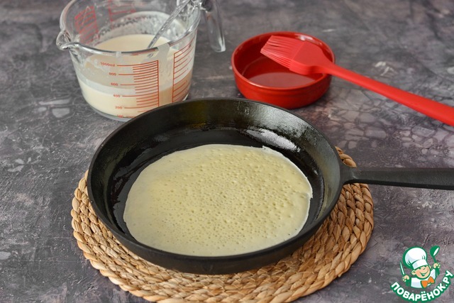 При помощи кисточки смажьте сковороду небольшим количеством масла и налейте немного теста. Объем теста буддет зависеть от диаметра вашей сковороды и личных предпочтений в плане толщины блинчика. Но, в среднем, для одного блинчика необходимо налить половину стандартного супового половника теста.