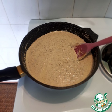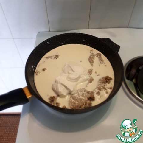 Перекладываем массу в сковороду, добавляем сливки и сметану, перемешиваем, доводим до кипения и сразу снимаем с огня.