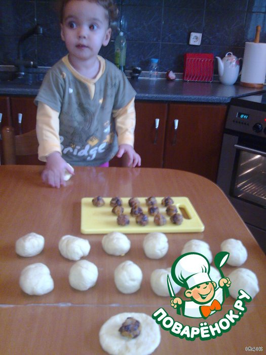 в центр кладем начинку и защипываем в форме шарика -