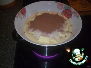 делаем глазурь: сгущенку, масло, сахар, какао смешать и сварить на водяной бане до полного растворения сахара.