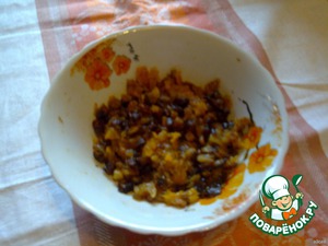 курагу, чернослив, изюм промыть, подержать в горячей воде и нарезать на мелкие кусочки.