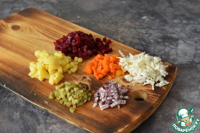 Полностью остывшие овощи (свеклу, морковь и картошку) нарежьте кубиками.