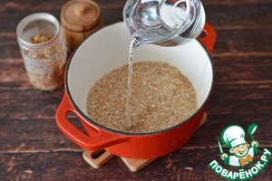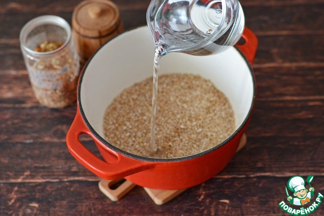 Всыпьте в казанок дроблёную полбу и влейте воду. -