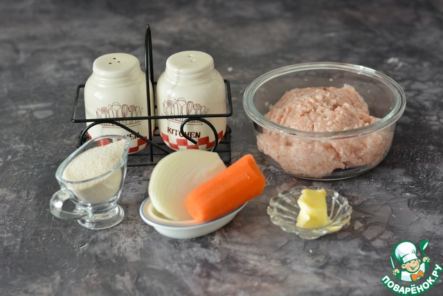 К куриному фаршу добавьте измельчённые лук и морковь, семолину, соль и перец.