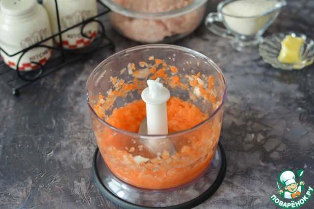 В чашу блендера положите лук и морковь, нарезав их произвольно, и измельчите в мелкую крошку.