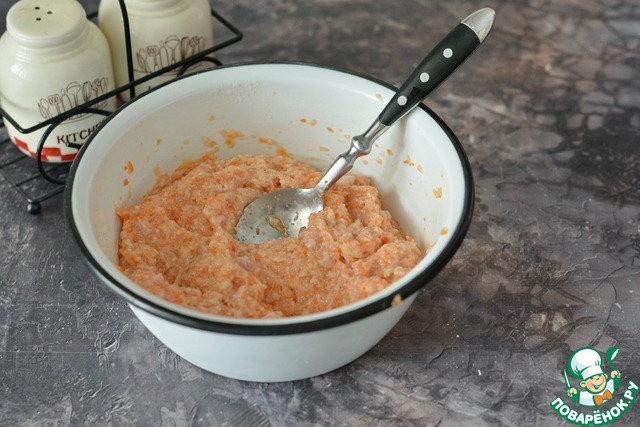 Тщательно размешайте фарш с семолиной, луком и морковью и оставьте под крышкой в холодильнике на полчаса, чтобы семолина набухла.