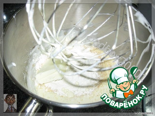 остльных 125 г мягкого сливочного масла хорошо , до бела взбить миксером,с 100 г сахара