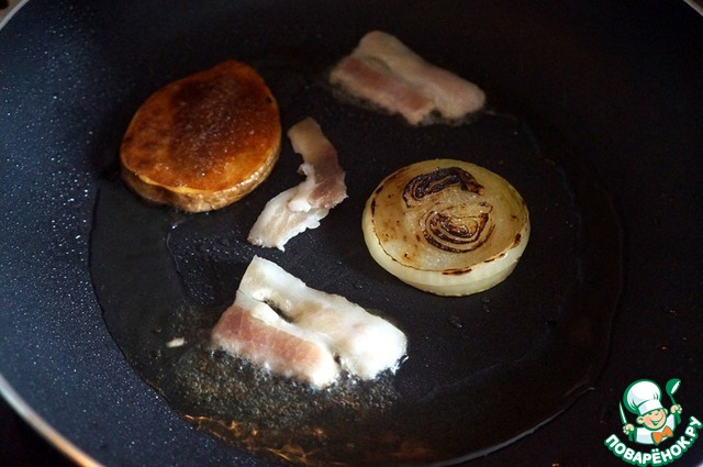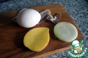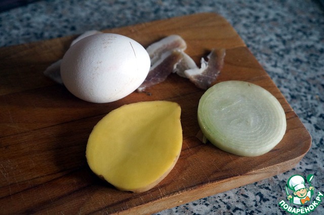 Клубень картофеля тщательно обмыть, затем, не снимая кожуры, вырезать из середины ломтик толщиной примерно 0,5-0,7 см. Вдоль или поперек – зависит от толщины картофелины. У меня получилось вдоль. Так же поступить с луковицей, но верхнюю шелуху убрать. С куска соленого сала срезать очень тонко пару-тройку ломтиков, убрав кожуру. Вот так все выглядит в итоге.