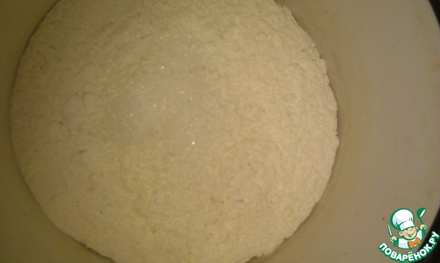 Отмерить и просеять муку. Смешать с мукой соль и сахар.