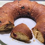 [+5]Готовить совсем несложно. За неимением клюквы, положила вяленую вишню. Выпекался 45 минут.