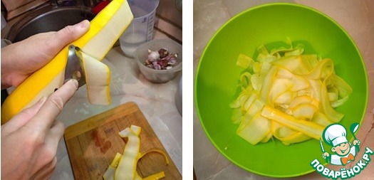 С помощью ножа для чистки овощей нарезать кабачок тонкими ломтиками.