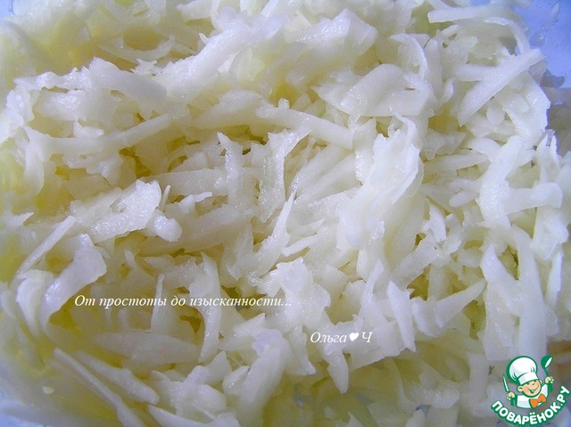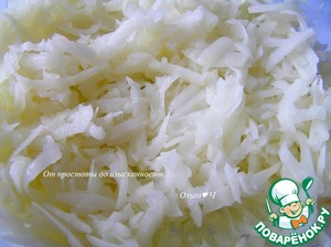 Приготовьте начинку. Натрите на крупной терке луковицу, затем картофель, перемешайте все вместе, чтобы картофель не потемнел.