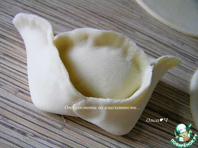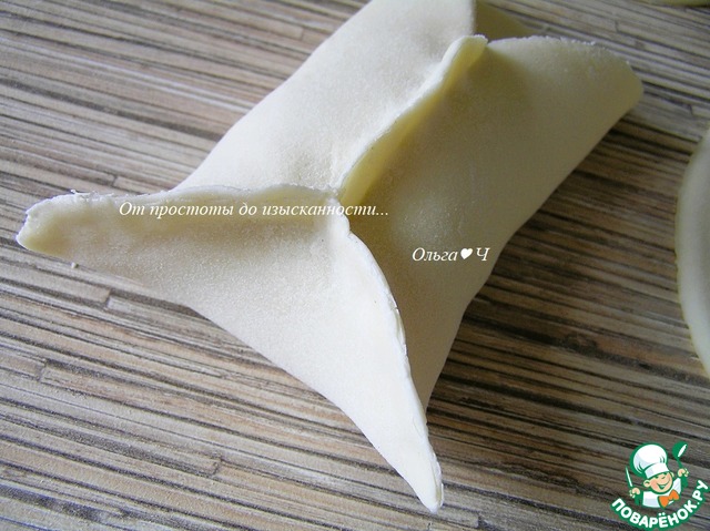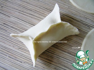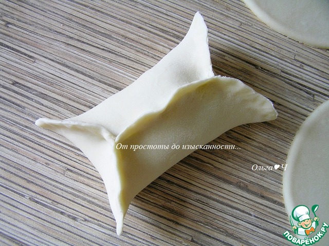 Разверните заготовку одним из открытых краев к себе, приподнимите край теста, прижмите к центру, затем нужно защипать края с обеих сторон.