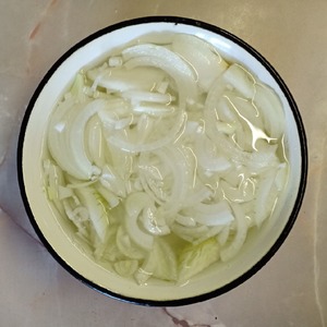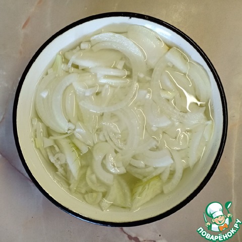 Лук нарезать тонкими полукольцами, залить холодной водой, добавить 50мл уксуса и оставить мариноваться минут на 15.