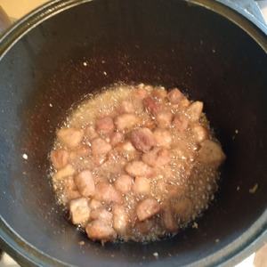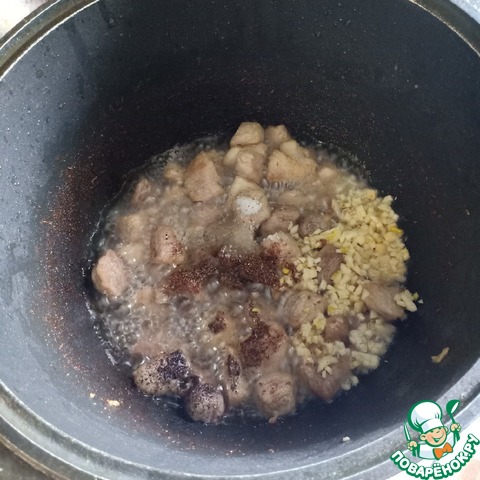 Свинину нарезать небольшими кусочками. В казан налить подсолнечное масло и на сильном огне обжарить кусочки мяса до золотистой корочки.