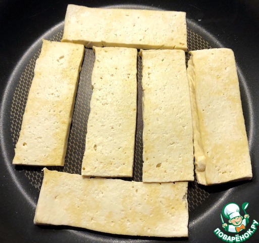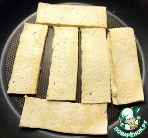 2. На сухой сковороде (без масла) обжариваем тофу с двух сторон (на небольшом огне) до появления слегка желтоватого оттенка (как бы подсушиваем). Можно сварить или на пару приготовить, но вкуснее, когда тофу немного подсыхает. -