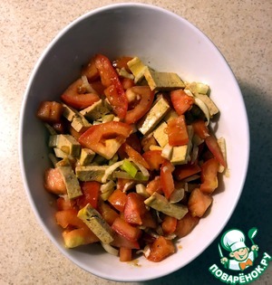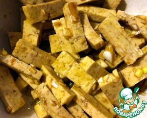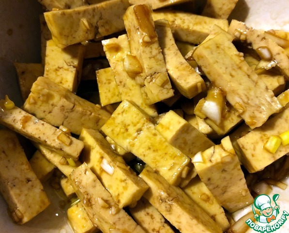 6. Остывшее тофу нарезаем на брусочки или кубиками и смешиваем с луком и чесноком.