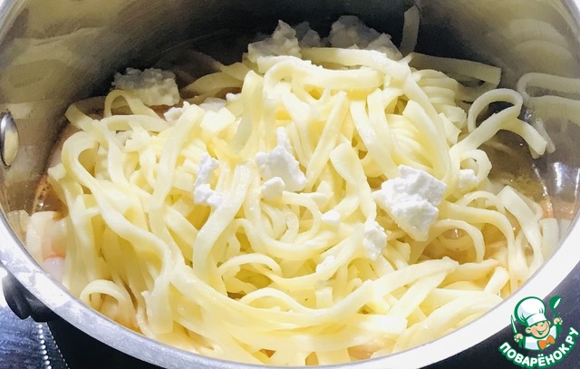 В кастрюлю с креветками добавить промытую пасту и оставшиеся 50 гр. Фета