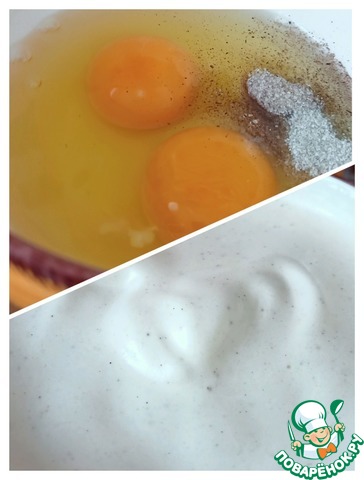 В отдельной посуде соединить яйца, ванильный сахар и соль, тщательно взбить миксером. Взбивать, постепенно увеличивая мощность, не менее 5 минут, чтобы получить хорошо взбитую белую массу.