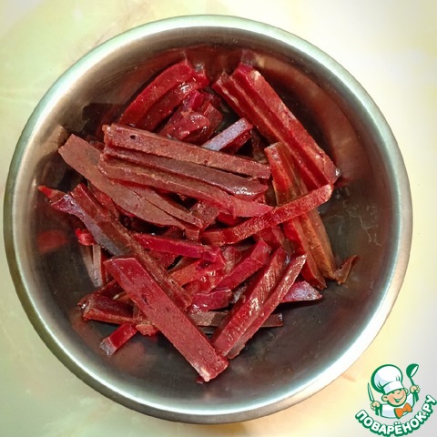 Печень хорошо помыть, убрать пленку и жилки, нарезать брусочками.