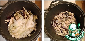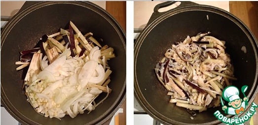 В хорошо разогретой сковороде или казане обжарить баклажаны с чесноком и луком в небольшом количестве масла, затем овощи вынуть.